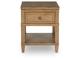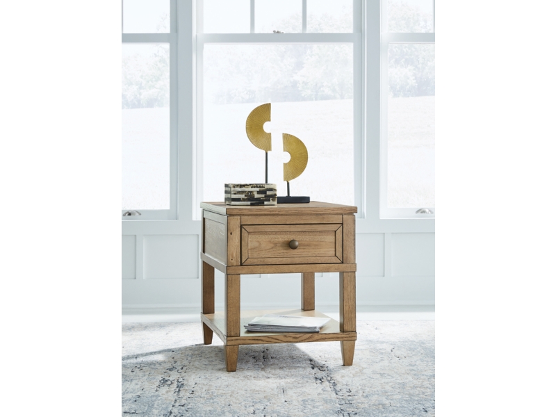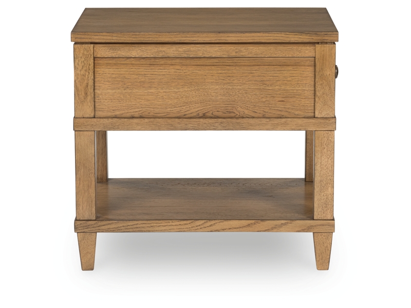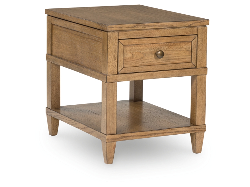 Taking a timeless approach to casual beauty, this end table brings easygoing elegance to the everyday. The light brown wood-tone finish seamlessly slips into your room’s aesthetic. A dark bronze-tone pull accents the drawer, adding to the table's fresh approach to transitional stylings. And built-in USB charging makes scrolling while lounging on the sofa that much more convenient.