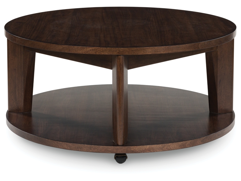 It's hard to say what's most striking about this round coffee table. Is it the rich warm brown finish or the thick tapered legs? Either way, the table's clean, contemporary aesthetic is perfect for your casual lifestyle. Casters let you roll the coffee table wherever you please … maybe next to your couch or loveseat.