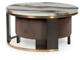Contemporary design. Made with antique brass finished metal frames and decorative paper laminates on MDF substrate. Legs are wrapped in a replicated dark walnut wood grain laminate. The cocktail table features a nesting upholstered ottoman covered in a chocolate brown velvet.