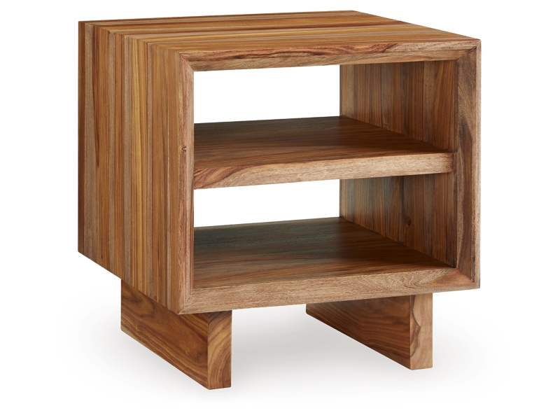 Discover something extraordinary with this clean-lined end table. The rich natural beauty of the wood, enhanced with a clear wood-tone finish, brings an organically stunning vibe to your seating area. Strikingly simple shelving displays your favorite decor in utterly chic style.