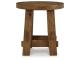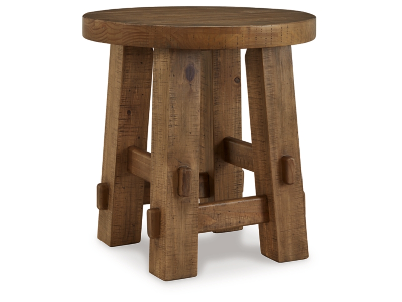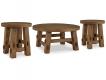 Casual Rustic design. Made with thick distressed Pine solids. Finished in a warm brown wood tone with rubbed glaze to enhance the distressed wood textures. Craftsmen inspired post and beam base design. Thick round tops.