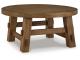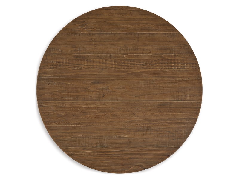 Casual Rustic design. Made with thick distressed Pine solids. Finished in a warm brown wood tone with rubbed glaze to enhance the distressed wood textures. Craftsmen inspired post and beam base design. Thick round tops.