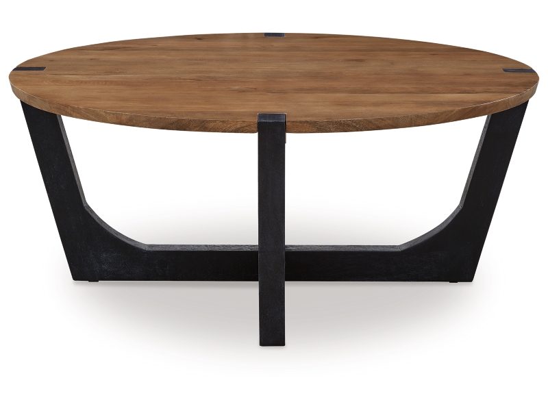 Natural Contemporary Design. Made with solid Mango wood. Two-tone finish scheme featuring a light brown top captured by solid wood legs finished in a warm black color. Tables have angled legs for a modern design that intersects with the top for added visual interest.