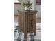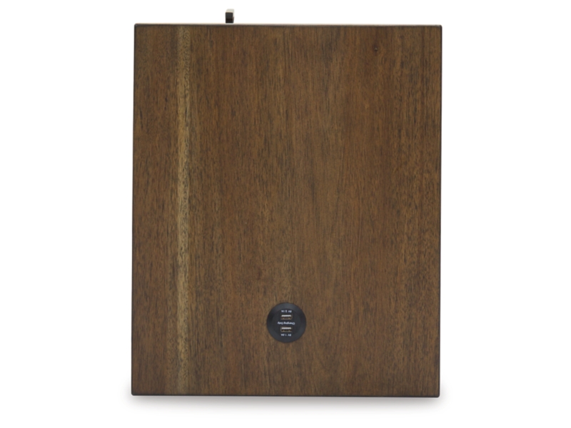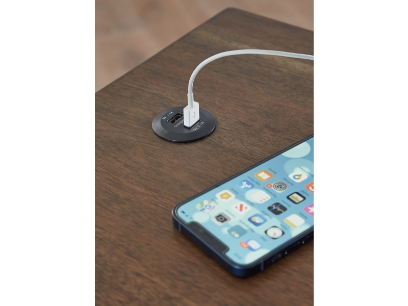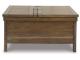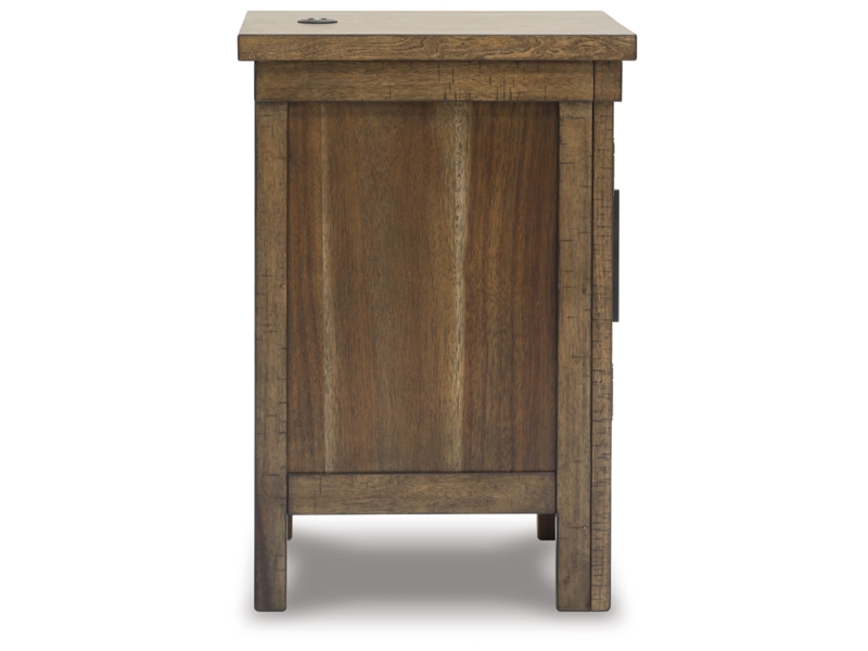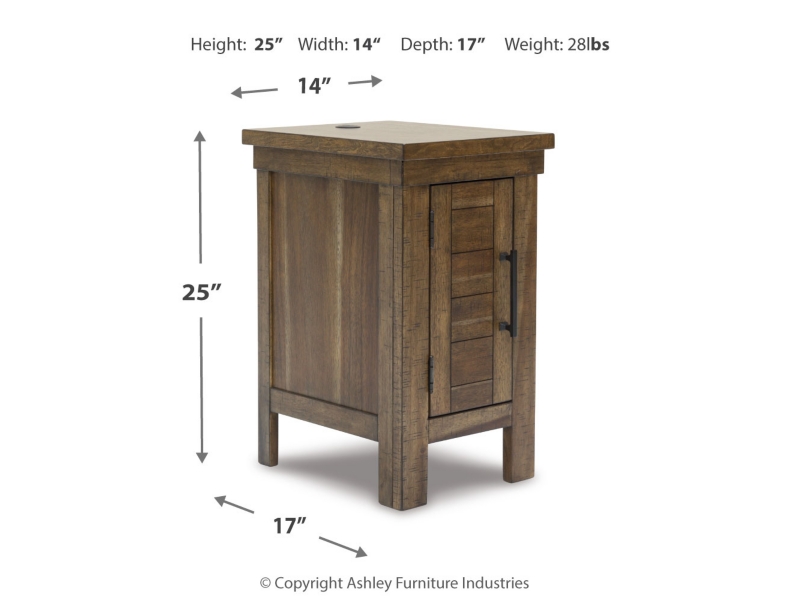 Casual lifestyle design. Made with Acacia wood solids and veneer with MDF substrate. The tobacco brown finish enhances the natural wood grain character. T731-9 cocktail trunk features a spacious storage bin on one side and a convenient lift top for added work or casual dining space. T731-3 end table features a double door storage cabinet. T731-7 chair side table includes a single door cabinet and a 110V power supply with dual USB charging ports.