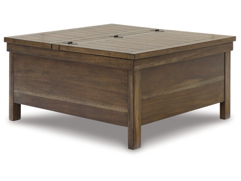 This lift-top coffee table might appear simple at first sight. But a closer look reveals beauty in the details. With a plank-effect tabletop, a tobacco brown finish and antiqued bronze-tone hardware, it’s simply beaming with charm. A handy lift top makes it easier than ever to eat, work or play from the comfort of your sofa. Crafted for form and function, this table will serve you well for years to come. 2 Matching chairside end tables included.