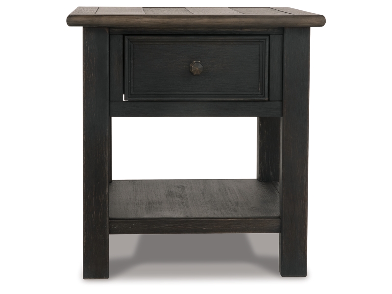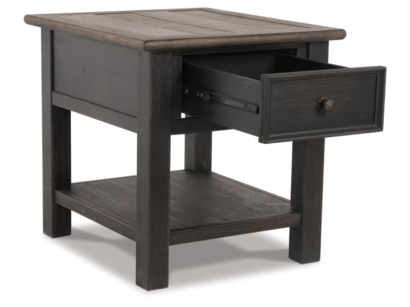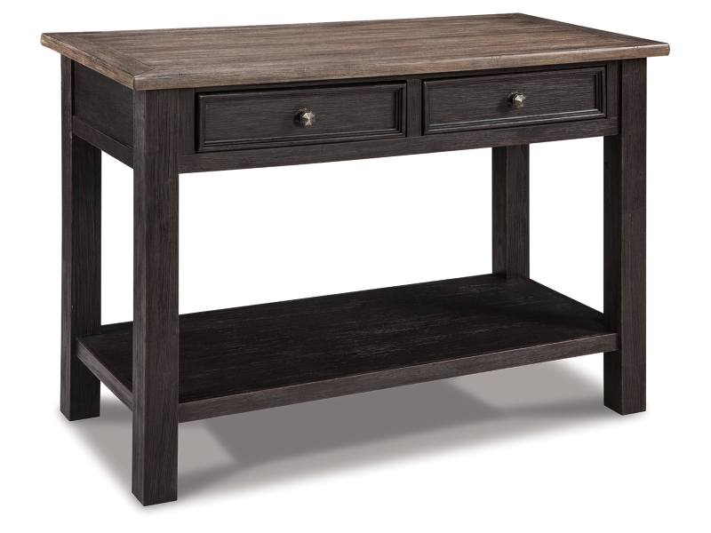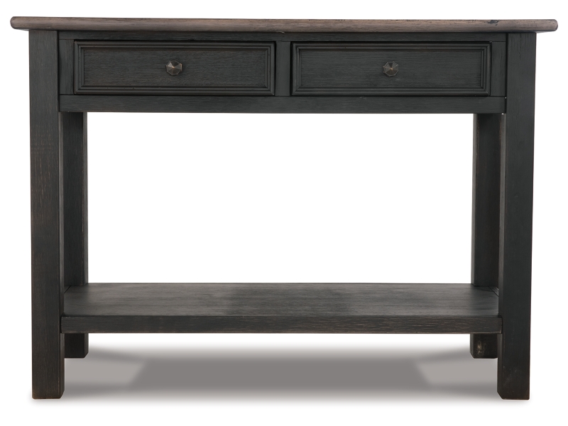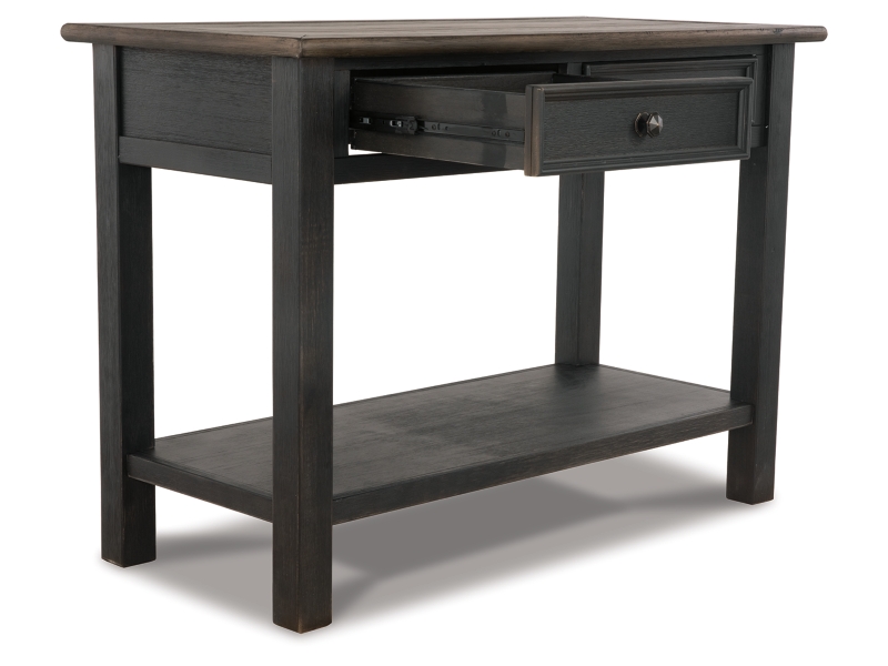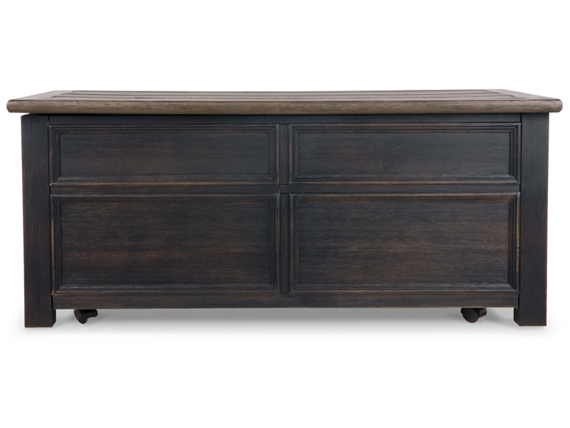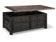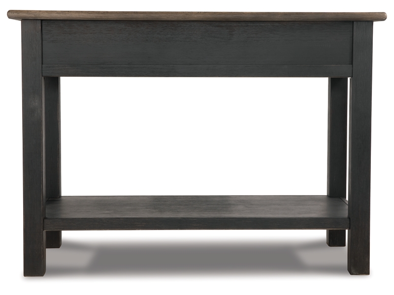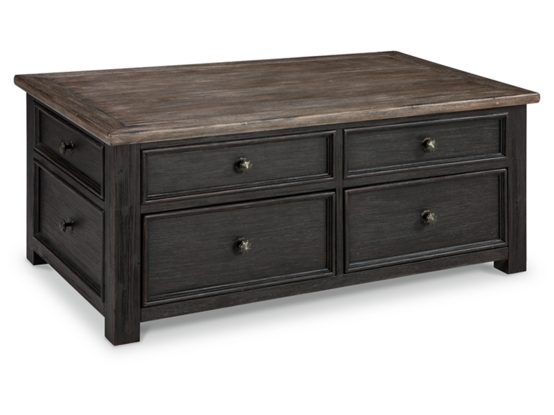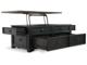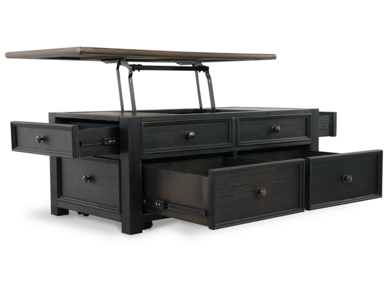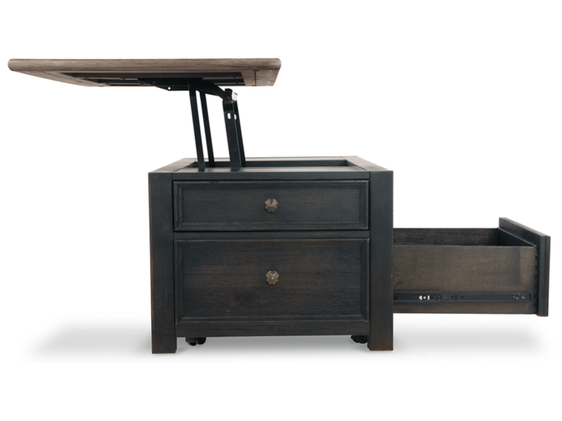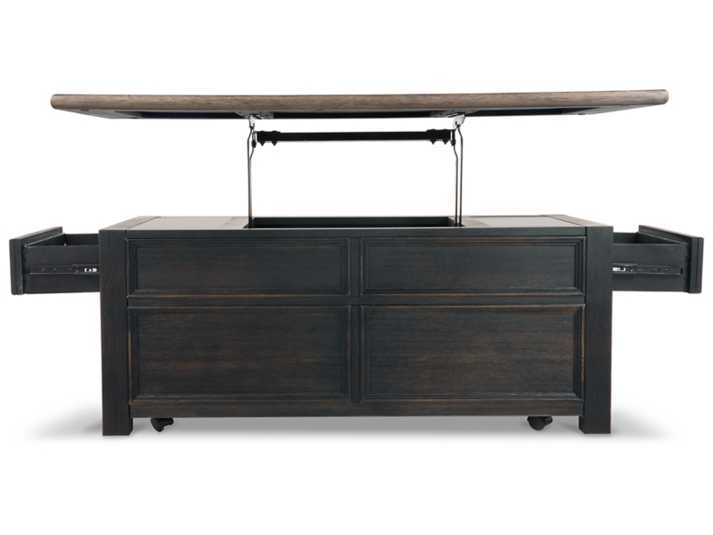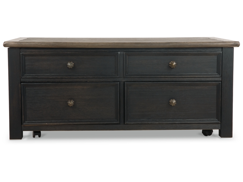 Shabby chic with a hint of down home country. This lift top coffee table with textured black finish, set of 2 end tables, and console is all the talk of today’s design world. Wood grain shows through the weathered gray-brown top in all of its earthy pleasure. Framed drawers are adorned with lovely traditional hardware. Smooth-gliding drawers make it easy for you to store away your belongings in style. Lift top transforms your space into a workstation without a hitch.