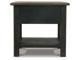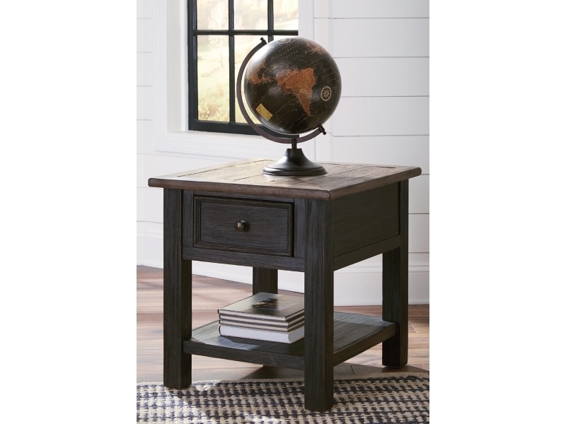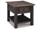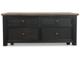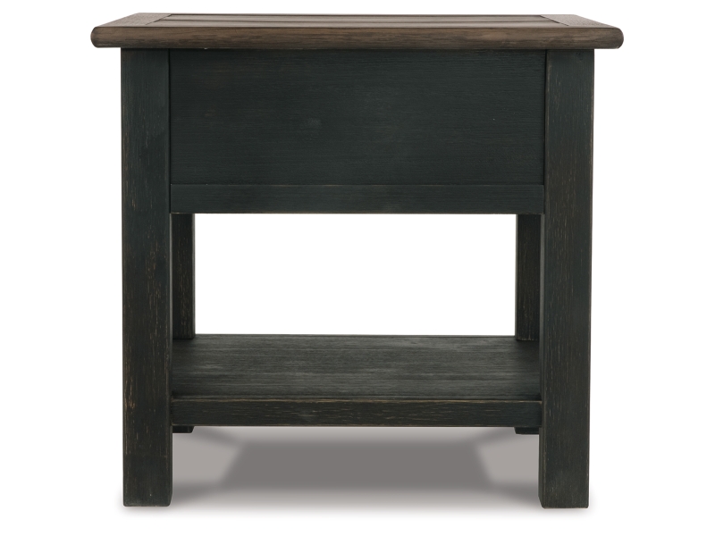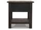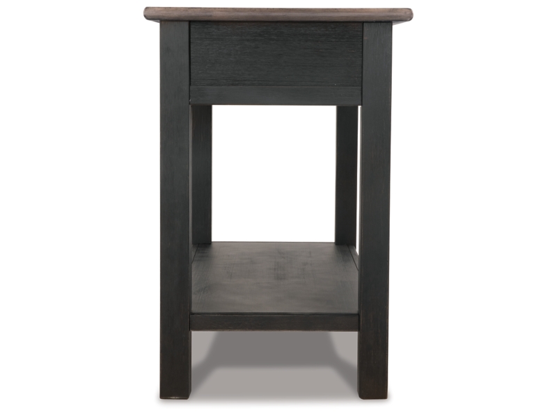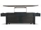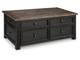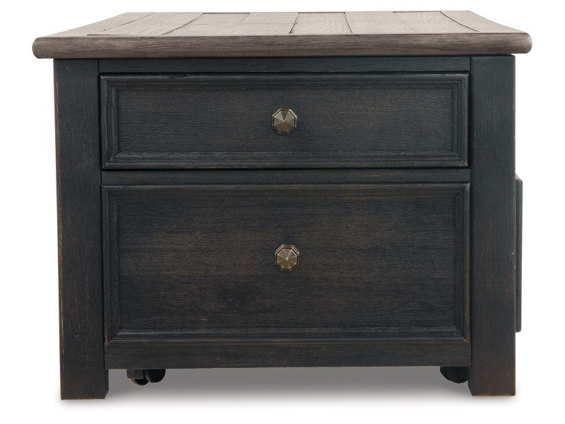 Made with select hardwood solids and White Oak veneers in a weathered grayish brown finish. Textured wire brushed base is finished in a black rub through color. Chair side end features an AC power supply with (2) USB charging ports. Magazine rack, tray with drink holders, and door storage. Cocktail table features lift top surface with finished interior, 4 drawers and casters for mobility. T736-107 has a plank-styled top. Smooth gliding drawer. Integrated 110V power supply with dual USB charging ports. Black faceted hardware.