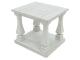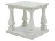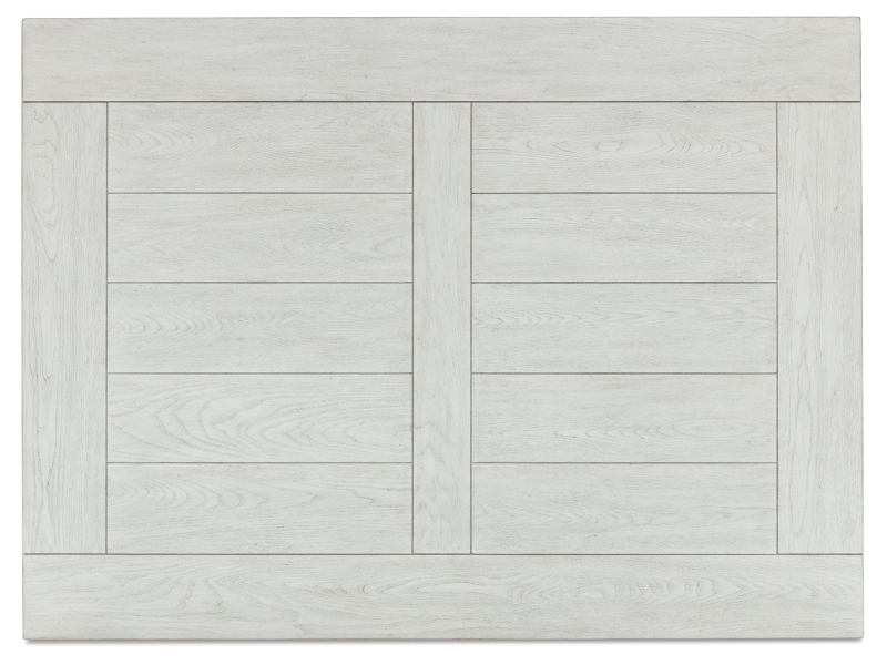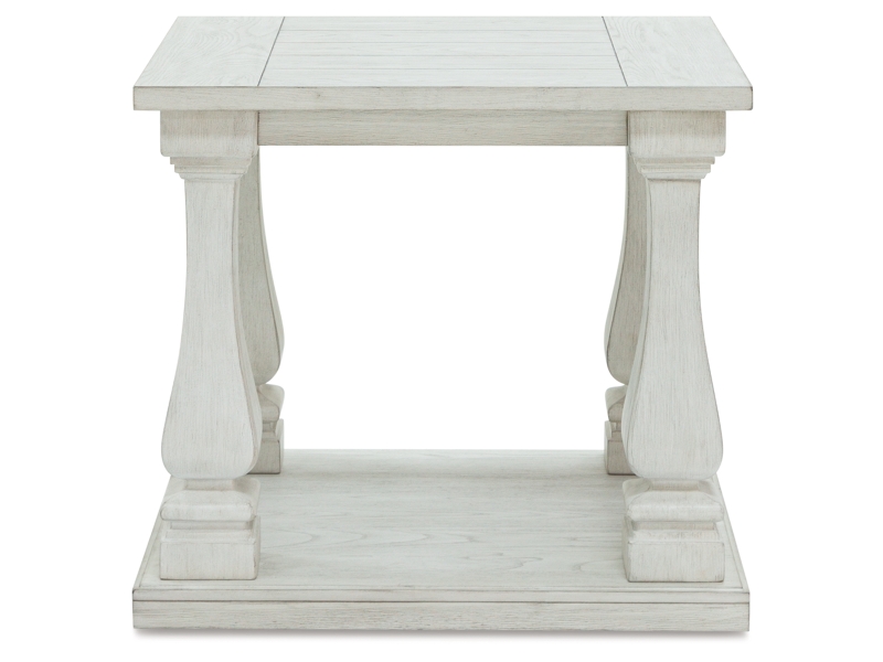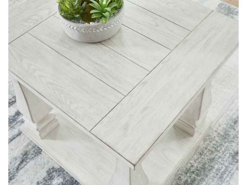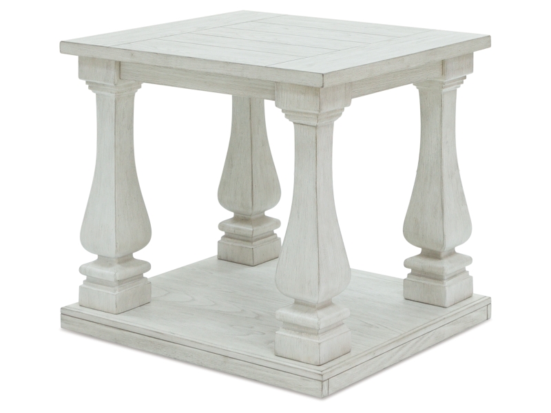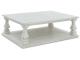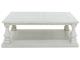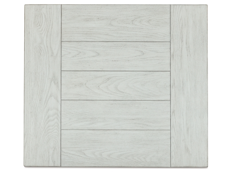 Casual traditional styling. Made with hardwood solids, Elm veneer with MDF substrates and cast resin legs. Antique white finish. Table tops feature a wide plank design. Square shaped baluster legs set on open lower shelf.