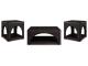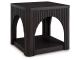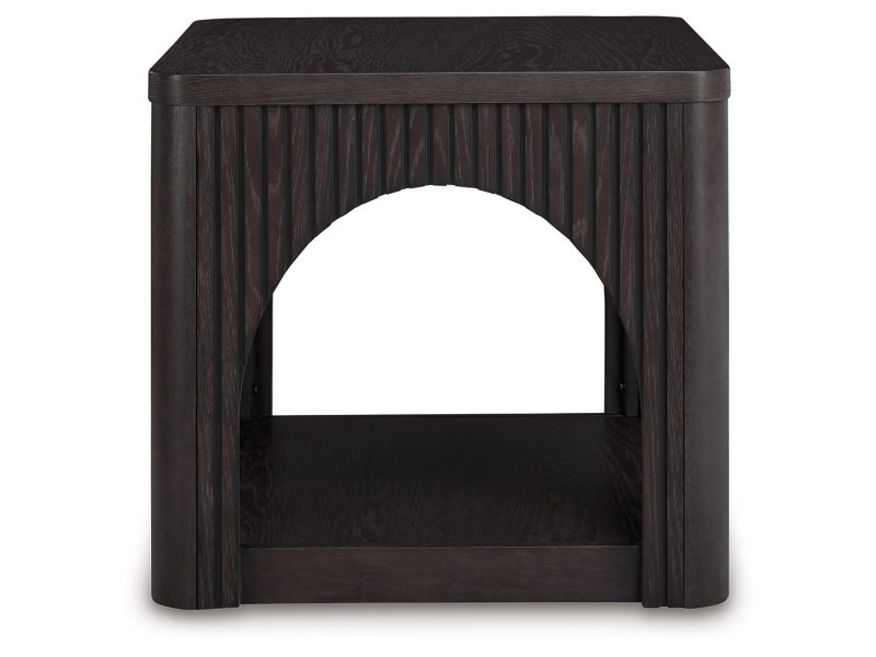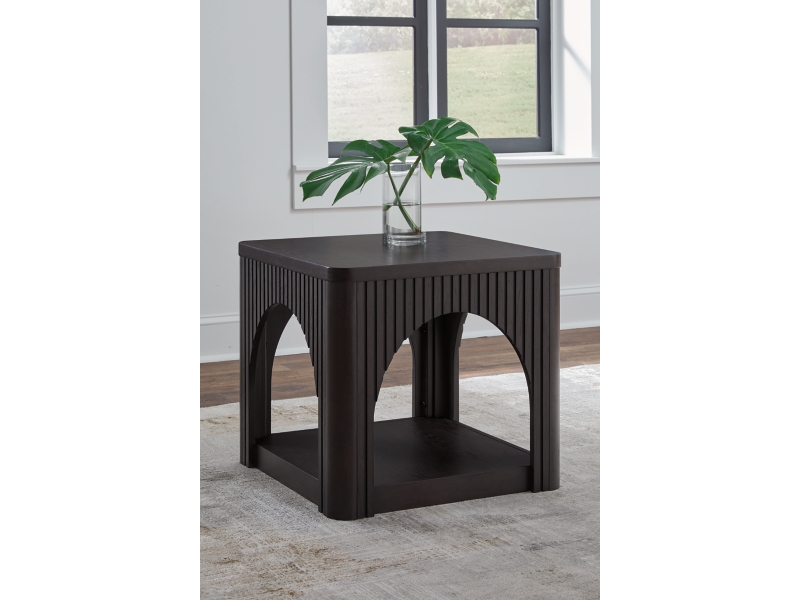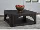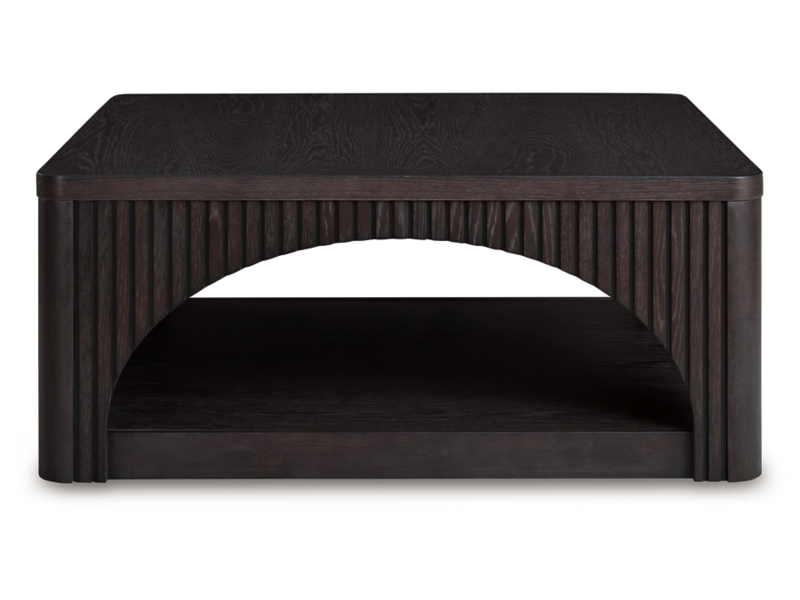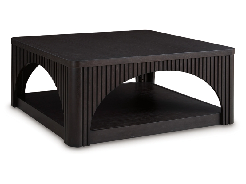 Transitional contemporary styling. Made with hardwood solids, Oak veneer and MDF substrate. Finished in a dark French black wood tone. Tables feature a trend-right architectural design with arches and stylized lattice details. Spacious lower shelves for decorative display. The large square cocktail table has casters for easy mobility.