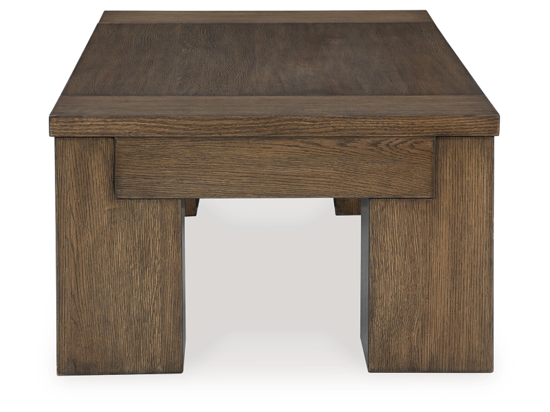 Casual contemporary styling. Made with solid wood components, Oak veneer and MDF substrate. Finished in a richly glazed brown wood tone. Table designs feature architectural geometry with bold chunky silhouettes. The cocktail table features a lift top for additional work or dining surface and casters for easy mobility. The end table includes a wireless charger conveniently located in the top.