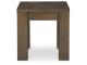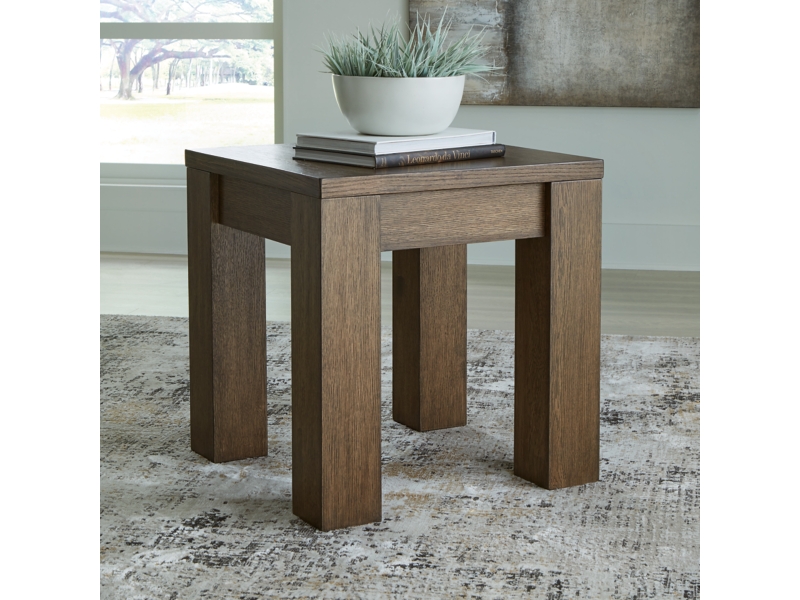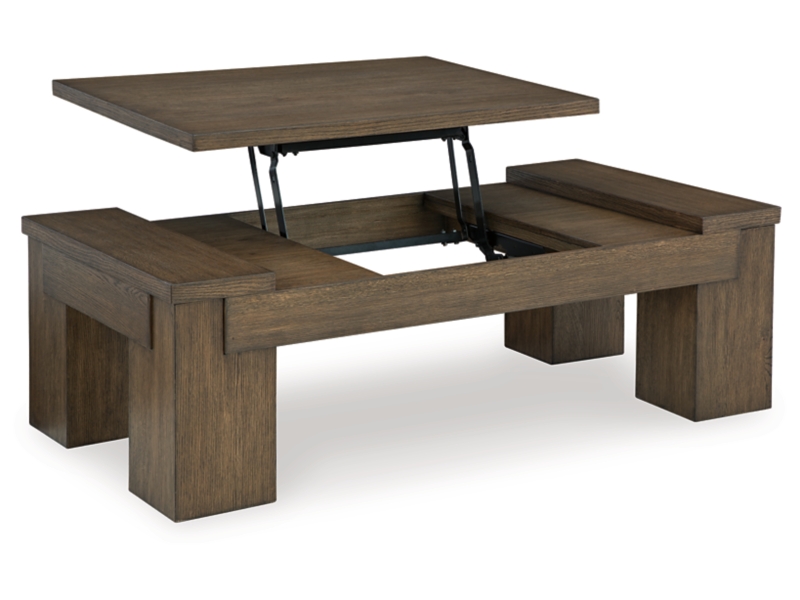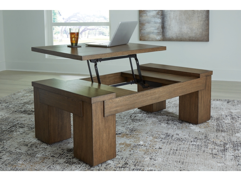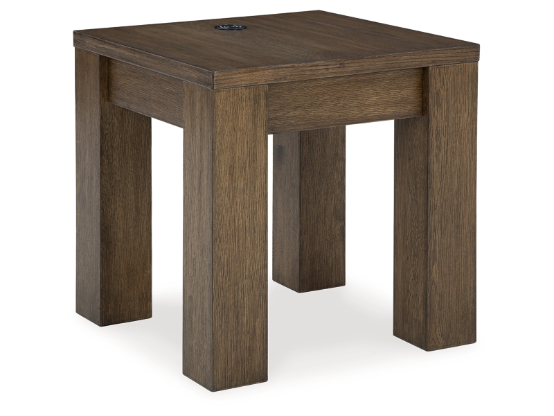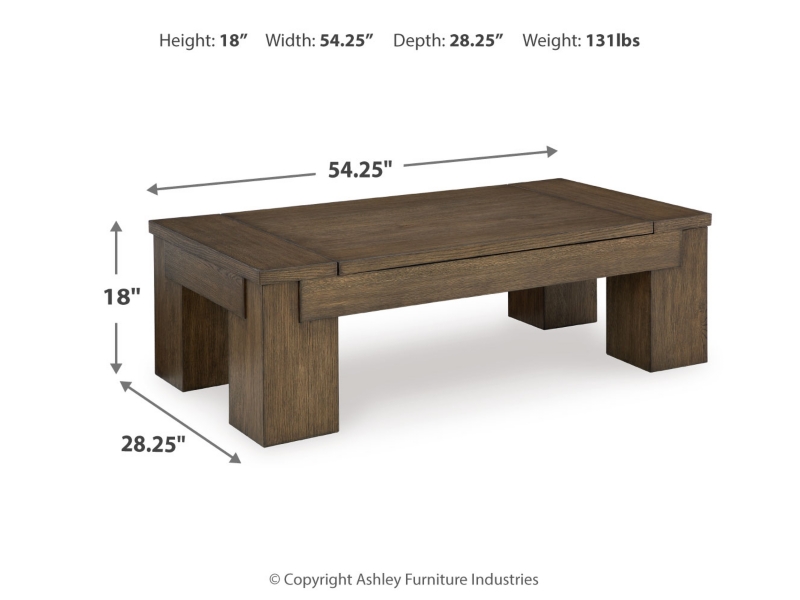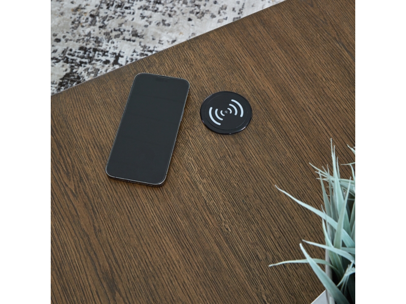Casual contemporary styling. Made with solid wood components, Oak veneer and MDF substrate. Finished in a richly glazed brown wood tone. Table designs feature architectural geometry with bold chunky silhouettes. The cocktail table features a lift top for additional work or dining surface and casters for easy mobility. The end table includes a wireless charger conveniently located in the top.