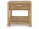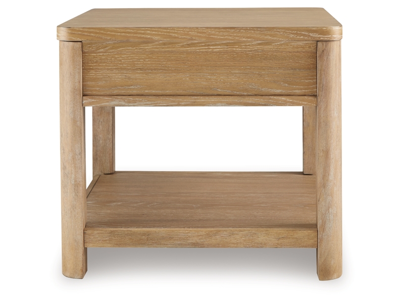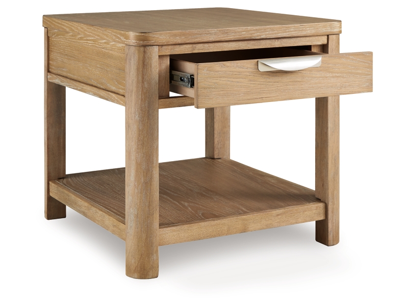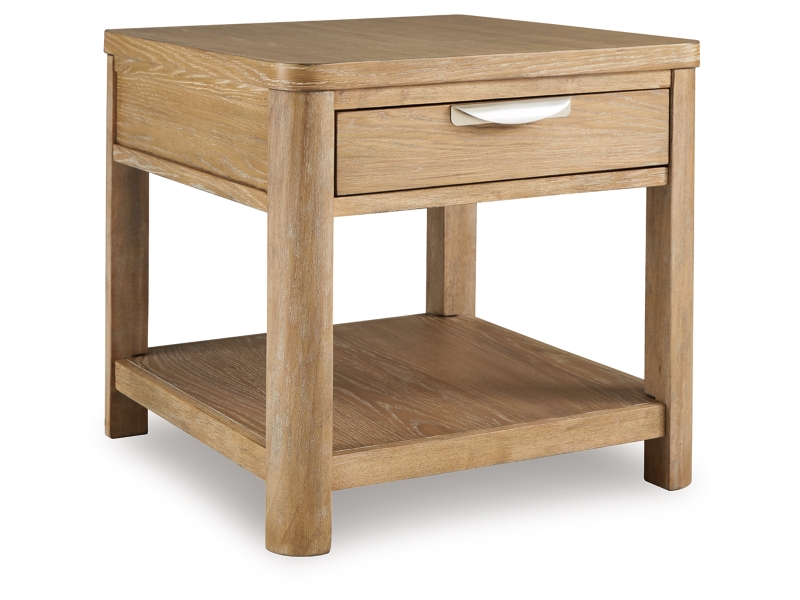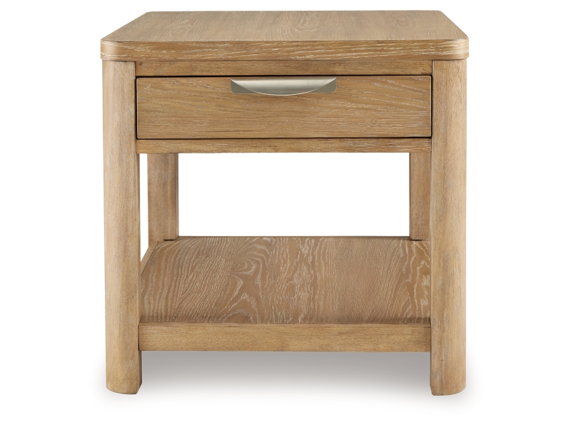 This end table's classic yet contemporary good looks are hard to deny. Softly shaped posts with a light oak finish and wire-brushed wood grain texture lend an organic appeal to your soothing space. A roomy drawer caters to additional storage needs while keeping clutter at bay. Plus there's plenty of display space on the lower shelf for treasures from your latest vacation.