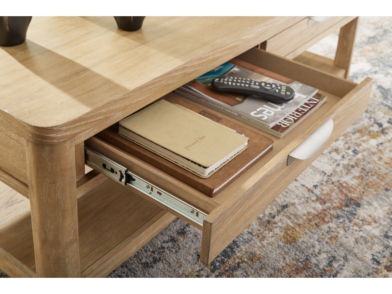 This coffee table's classic yet contemporary good looks are hard to deny. Softly shaped posts with a light oak finish and wire-brushed wood grain texture lend an organic appeal to your soothing space. Roomy drawers cater to additional storage needs while keeping clutter at bay. Plus there's plenty of display space on the lower shelf for, ahem, coffee table books. 2 Matching end tables included.