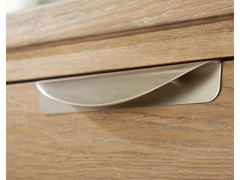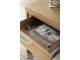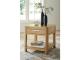 Transitional Contemporary design. Made with rubberwood solids, Oak veneer and MDF substrates. This light Oak finish with light wire-brush wood grain texture adds an organic look. T781-1 cocktail table features two drawers with fully finished interiors, ball-bearing side glides and casters. Large lower shelf for display. End table includes one drawer and open lower shelf.