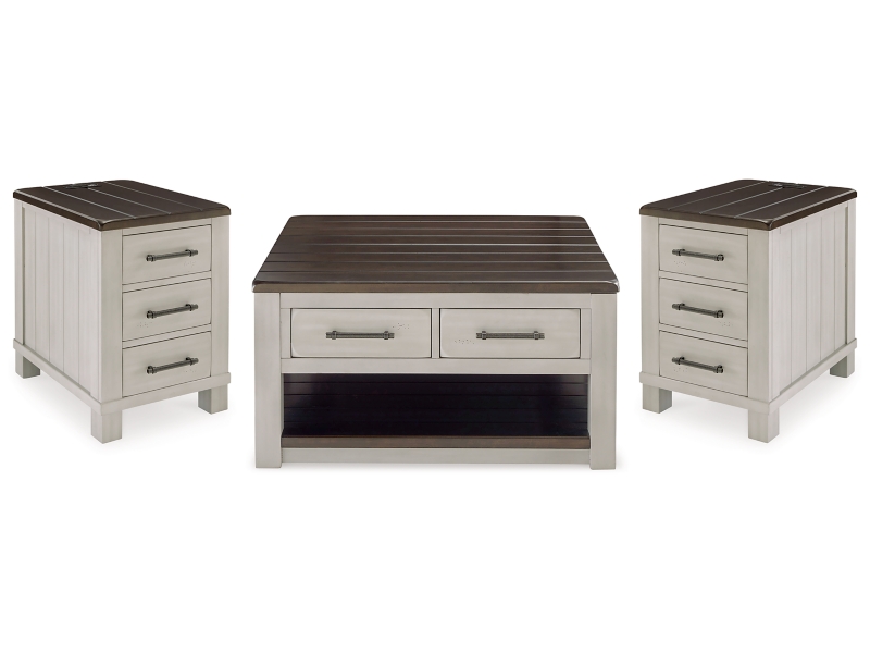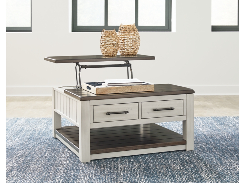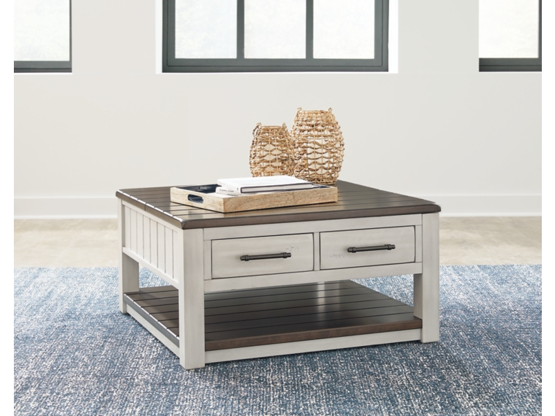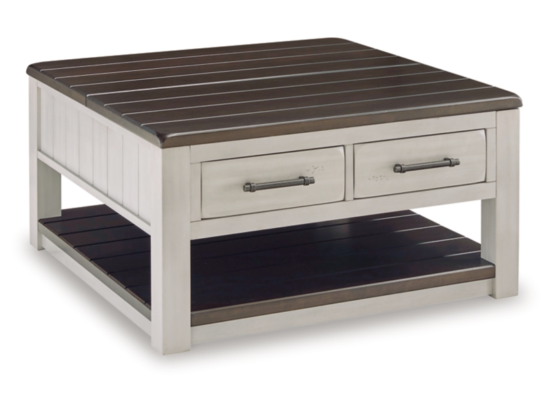 Make a farmhouse-inspired statement with this coffee table. Beautifully crafted to stand the test of time, the planked look and clean two-tone finish lend a relaxing vintage feel. A clever lift-top section and spacious storage drawers double up on form and function. 2 Matching chairside end tables included.