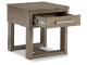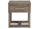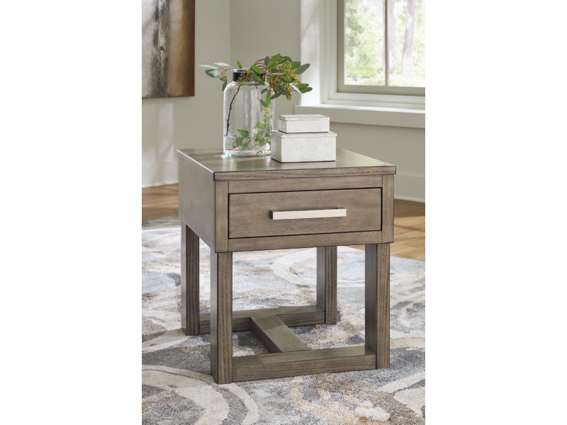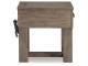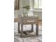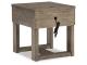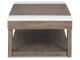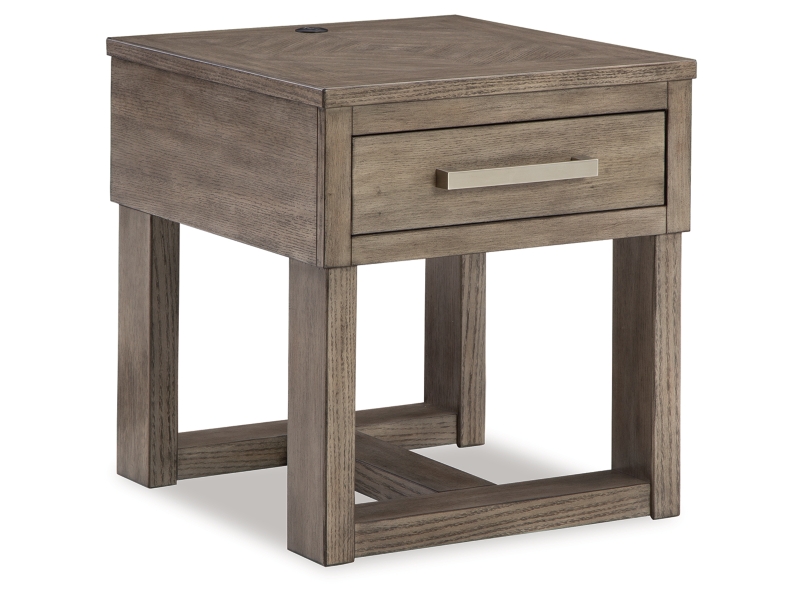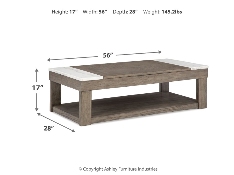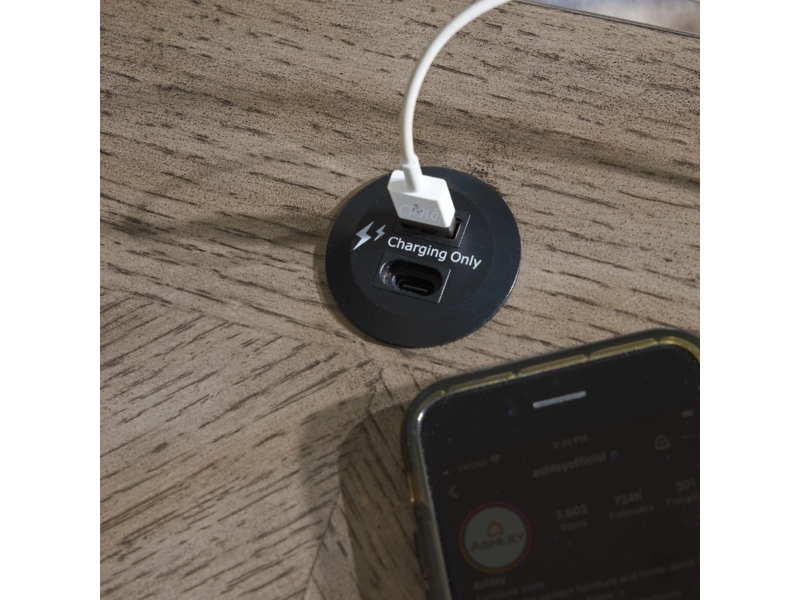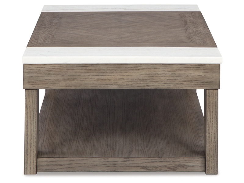 Casual lifestyle design. Made with Oak veneer and MDF substrate. Finished with a trend-right grayish brown wood tone. The cocktail table features a spacious lower shelf with casters, and natural white marble accents on each side of the center lift top. Matching end table includes a drawer and dual USB charging port conveniently located in the top.