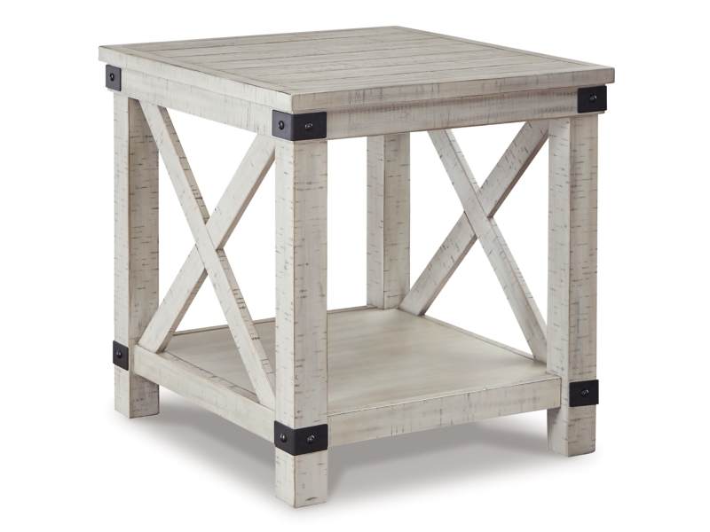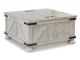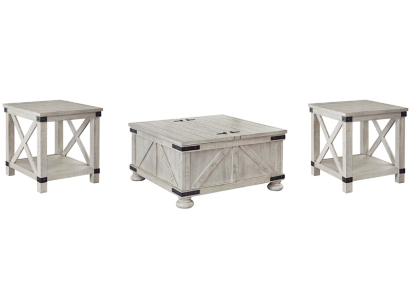 Double up on form and function with this square coffee table with storage. Its dual-lid tabletop provides easy access to the roomy storage space. Crafted with a distressed whitewash finish, crossbuck detailing and metal bracket appliques, this generously scaled coffee table is rustic farmhouse living at its best. 2 Matching end tables included.
