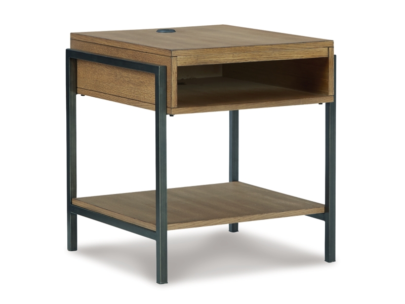 Urban contemporary styling. Made with engineered wood substrate, Oak veneer and metal frames. A stylish bunching round cocktail tables features a suspended main drum with faux cement melamine lift-top and a smaller storage trunk on casters. The T964-3 rectangular end table has an open storage shelf and built in USB charger port to conveniently keep your electronic devices handy while they charge. T964-8 nesting table dimension: 27"W x 27"D x 10"H.