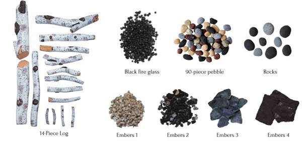 BIRCH ‐ Deluxe 15 piece log set, black fire glass, 90 piece pebbles, rocks, embers