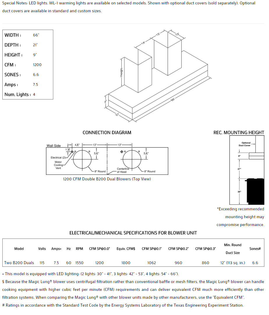 Thick rectangle styling. Click on the models for a list of our base model numbers for standard sizes; simply select the model you need, and then specify the finish (painted or stainless steel). Not available in real brass, real copper, or hammered copper. Recommended mounting height 27" above the cooking surface. Shown with matching wall mount duct covers (sold separately), available in standard sizes for 7', 8', and 9' ceiling heights or in custom sizes. All Vent-A-Hood products are suitable for use in damp locations (outdoor applications such as a covered patio) when installed in a GFCI protected branch circuit.