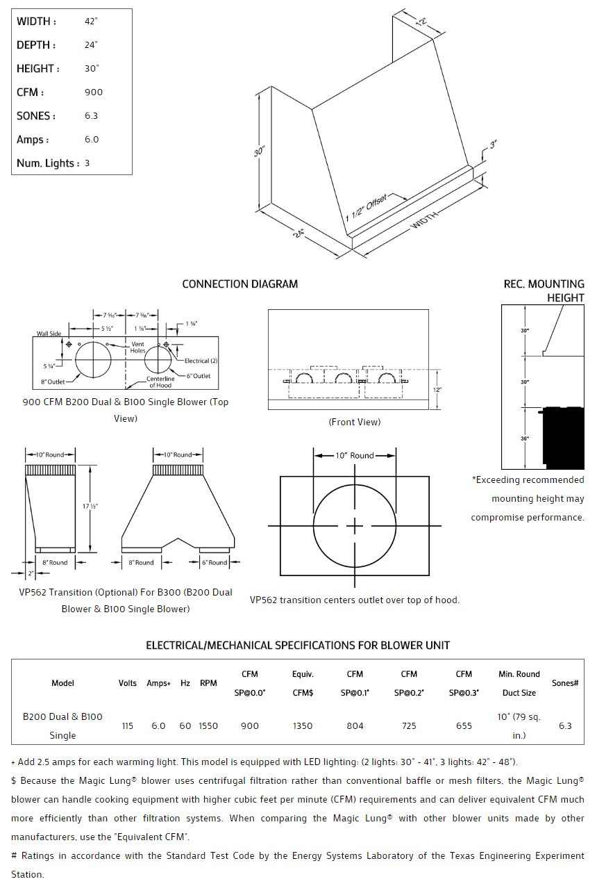 Features clean slope and defined front end. Heat lamps may also be added to selected models. Click on the models for a list of our base model numbers for standard sizes; simply select the model you need, and then specify the finish (painted, stainless steel, real brass, real copper, or hammered copper). Recommended mounting height is 30" above the cooking surface. All Vent-A-Hood products are suitable for use in damp locations (outdoor applications such as a covered patio) when installed in a GFCI protected branch circuit.