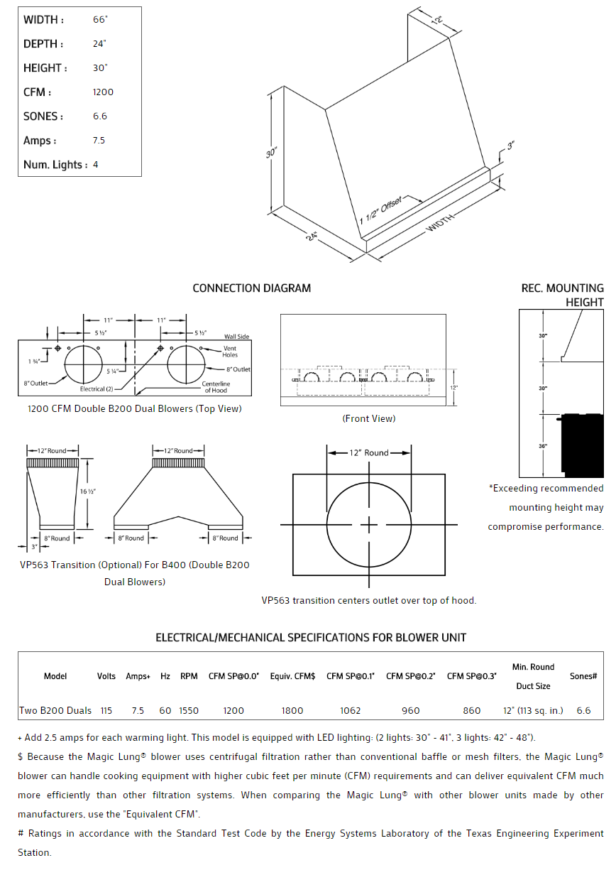 Features clean slope and defined front end. Heat lamps may also be added to selected models. Click on the models for a list of our base model numbers for standard sizes; simply select the model you need, and then specify the finish (painted, stainless steel, real brass, real copper, or hammered copper). Recommended mounting height is 30" above the cooking surface. All Vent-A-Hood products are suitable for use in damp locations (outdoor applications such as a covered patio) when installed in a GFCI protected branch circuit.