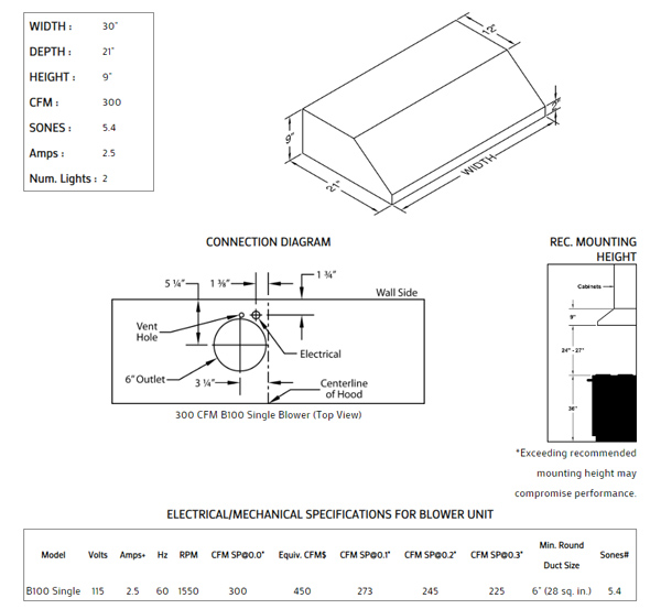 Linear styling perfectly accents the Professional-styled kitchen. Includes the Magic Lung® blower system. Lights feature a dual switch for dimming. Equipped with the SensaSource® heat sensor. Available in popular standard or custom paint colors, stainless steel, real brass, real copper or hammered copper. Recommended mounting height is 24" to 27" above the cooking surface. Suitable for use in covered outdoor applications when installed in a GFCI protected branch circuit. Also available in custom sizes.