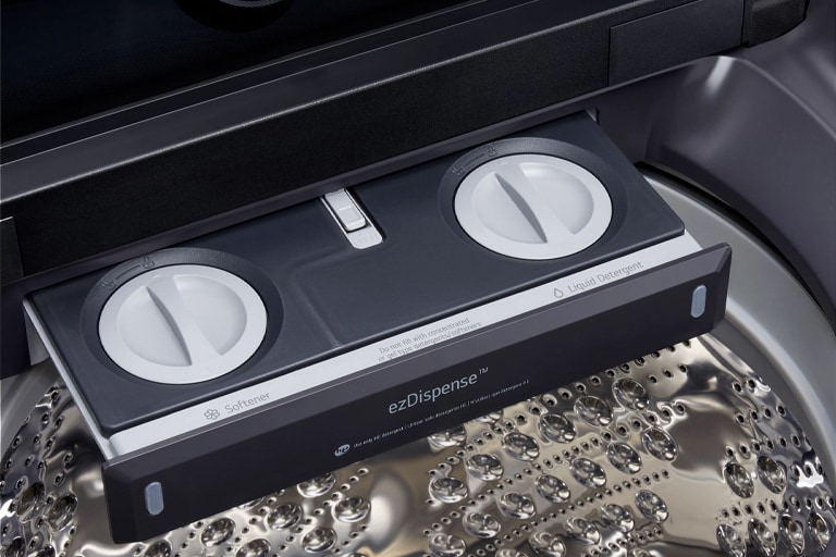 *Based on 9-13 lb. loads in normal mode, up to 14 loads when using detergent and softener; up to 25 loads when using both compartments to dispense detergent only. Always use HE (High-Efficiency) detergent with this washer. Use the ezDispense® Nozzle Clean function to periodically clean the reservoirs or before changing the softener reservoir to a detergent reservoir and vice versa. **Wi-fi and app required. Features subject to change. See lg.com for additional details and privacy information.
